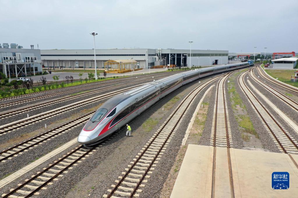 在位于山东青岛的中车四方股份公司,一辆复兴号列车正在出厂(2021年7月1日摄)。新华社发