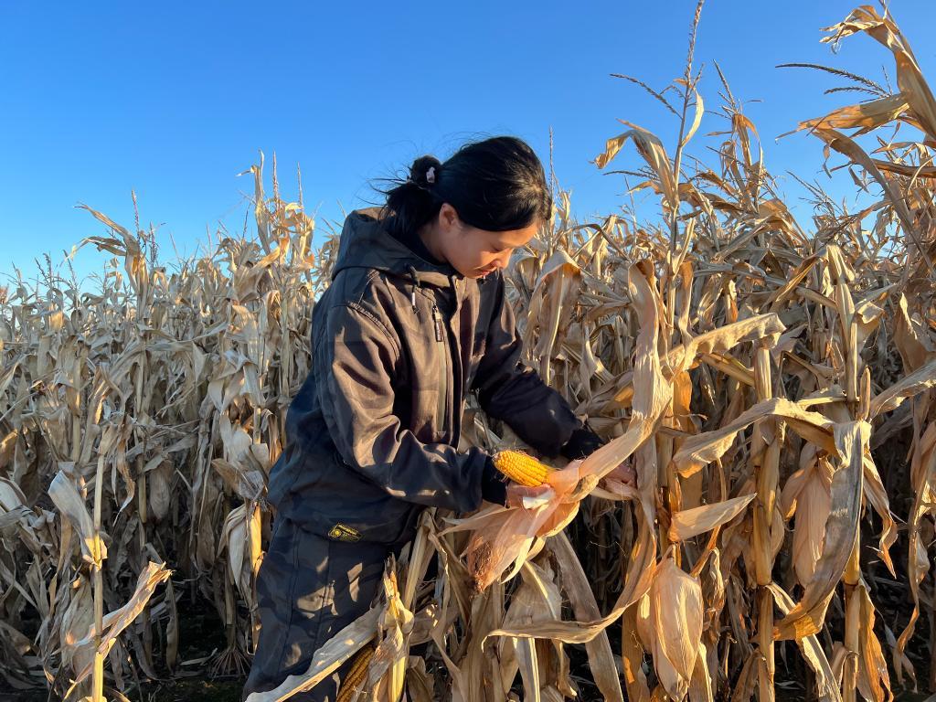 “你看,玉米粒之间缝隙比较小,说明现在水分还有些大,需要过两天才能收获。”在一片金黄的玉米地,魏代玲随手拿起一棒玉米,剥开它的层层“外衣”,将其掰成两半,观察当前长势。
