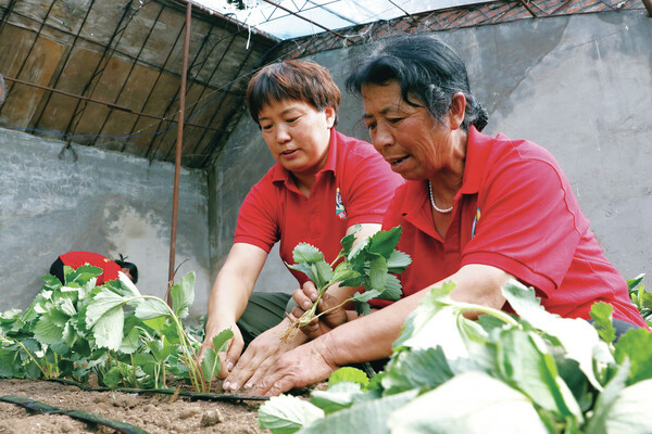 齐晓景(左)与工人一同栽植草莓秧苗。(来源:兴安日报社)