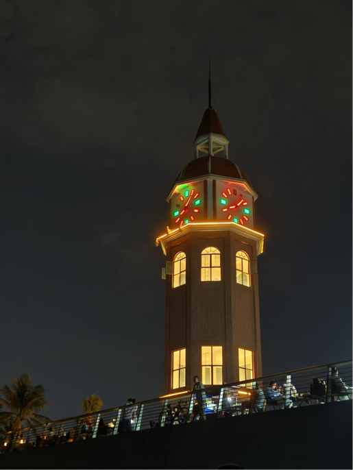 夜幕降临,我们来到了观海台,钟楼亮起暖黄色的灯光,凉爽的晚风
