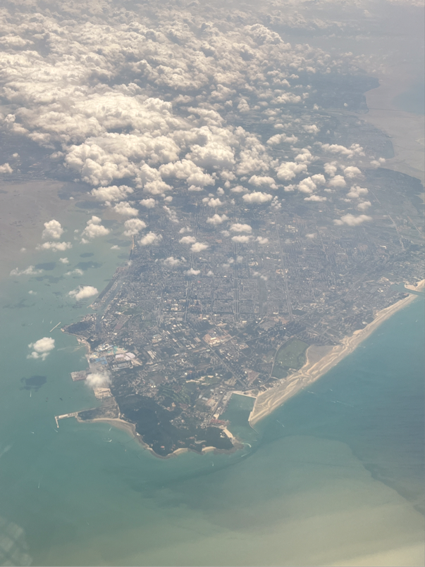 舷窗隔绝了舱外的气流,我望着海口在云层缝隙中时隐时现。城市边缘的海岸线像一道