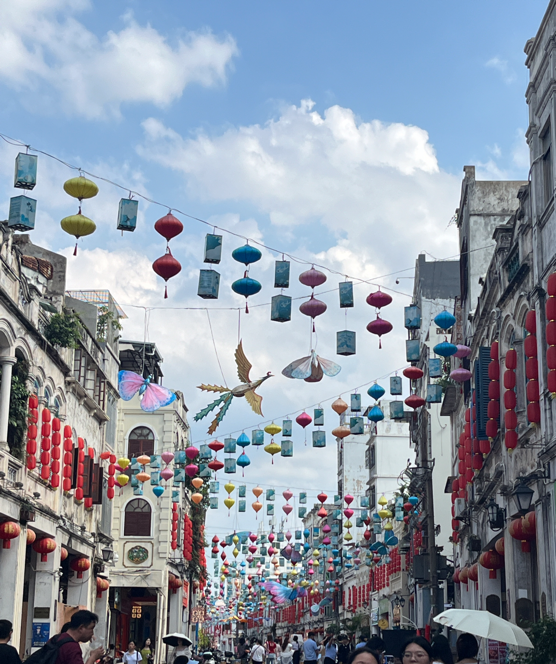 七彩的灯笼与栩栩如生的蝴蝶凤凰挂件在蓝天的映衬下显得格外有氛围感。踏入老街,
